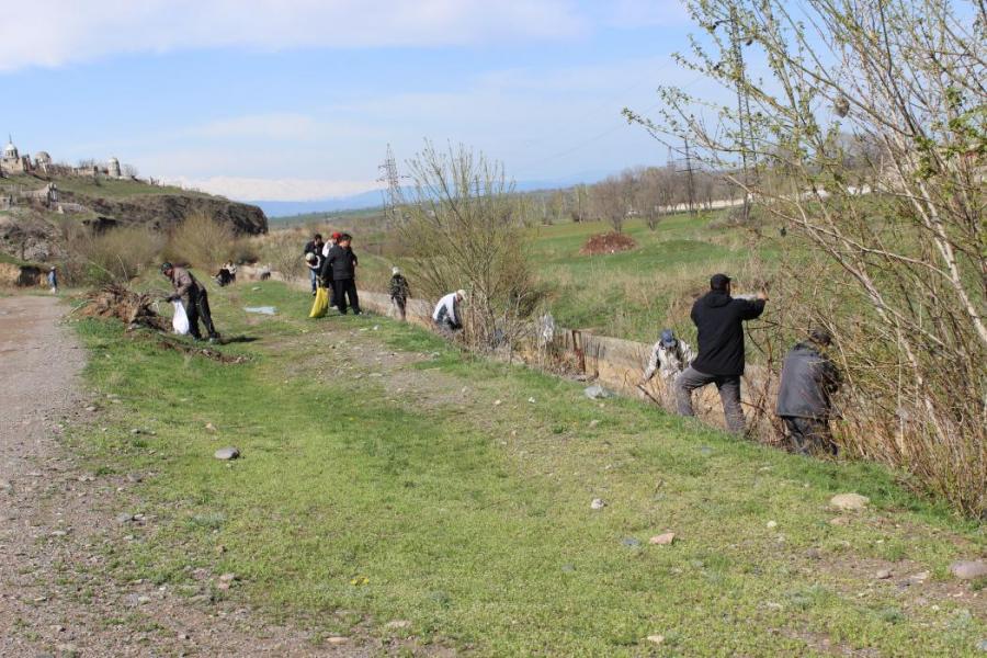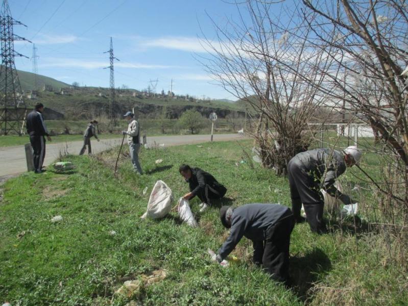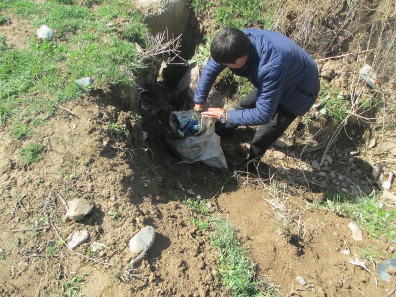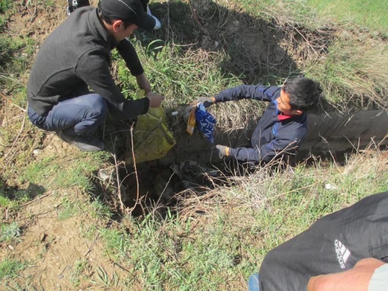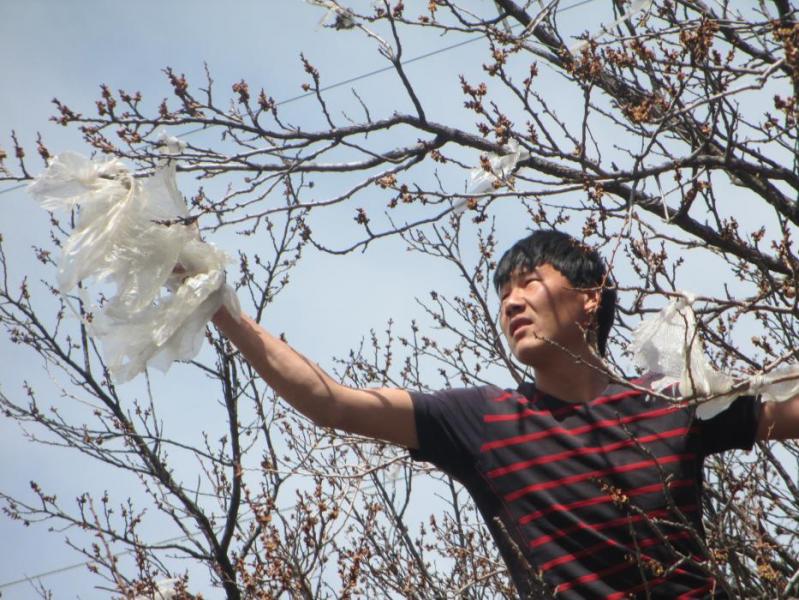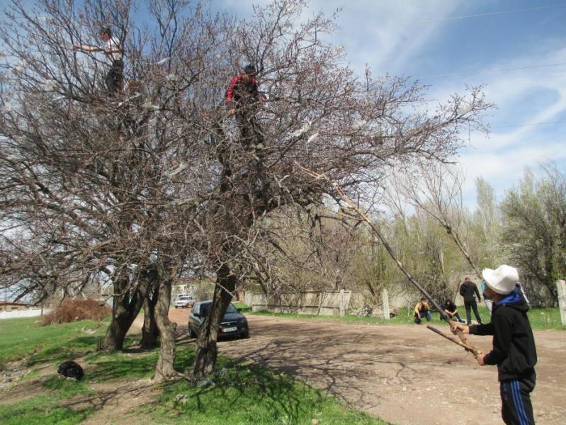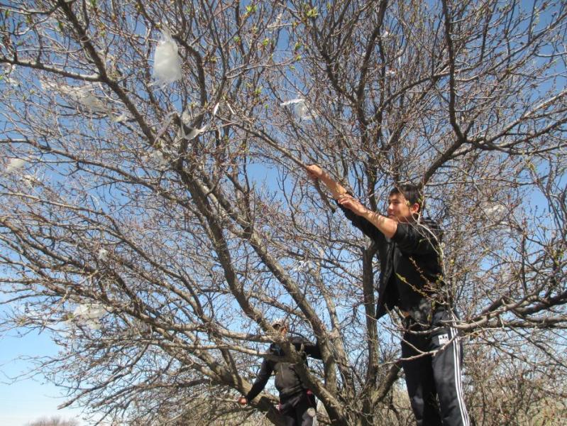 В городе Кемин с деревьев снимают целлофановые пакеты, которые «облепили» их (фото)